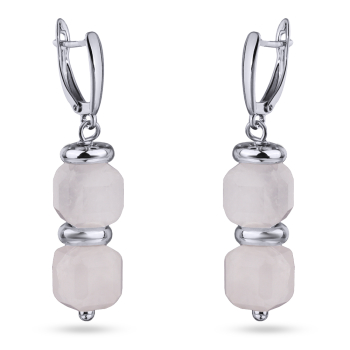 Изготовлено из ювелирного сплава на основе латуни с гальваническим покрытием родием. Изделие украшает розовый граненый кварц диаметром 7мм. Длина серьги 3.5см. Английская застежка.