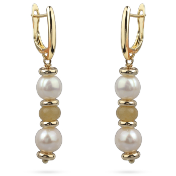 Изготовлено из ювелирного сплава на основе латуни с гальваническим покрытием золотом. Изделие украшает белый натуральный жемчуг 8мм и кварц. Размер серьги 4.5х0.8см. Английская застежка.