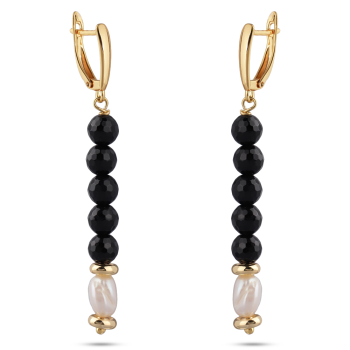 Изготовлено из ювелирного сплава на основе латуни с гальваническим покрытием золотом. Изделие украшают жемчуг белого цвета и черный агат диаметром 6мм. Длина серьги 6см. Английская застежка. *Цвет и форма жемчужин может отличаться от изображенной на фото