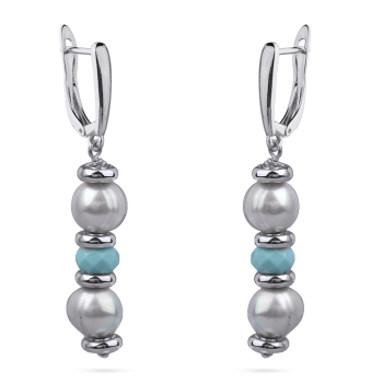 Изготовлено из ювелирного сплава на основе латуни с гальваническим покрытием родием. Изделие украшает серо-голубой натуральный жемчуг 8мм и бирюза. Размер серьги 4х0.6см. Английская застежка.