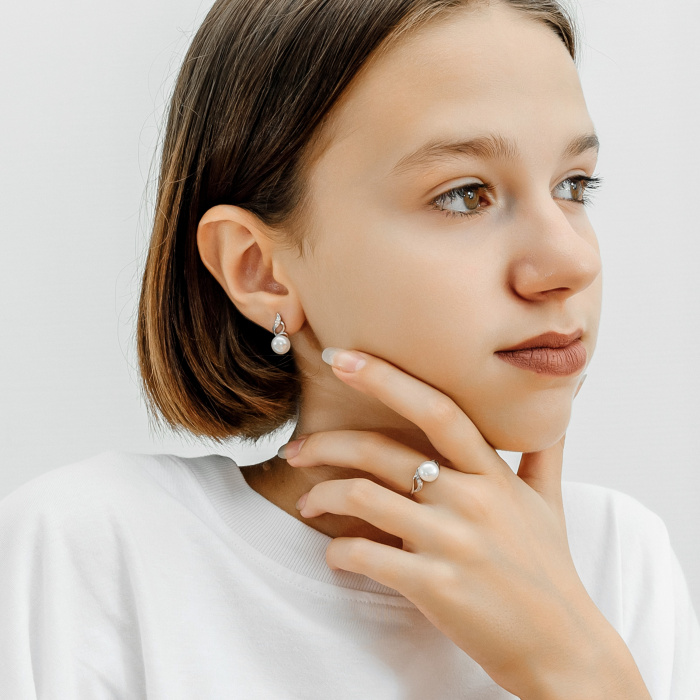 Вставка: жемчуг культивированный Размер жемчуга: 8-8,5 мм Форма огранки жемчуга: Кабoшон Покрытие: Родий Дополнительные вставки: Фианиты