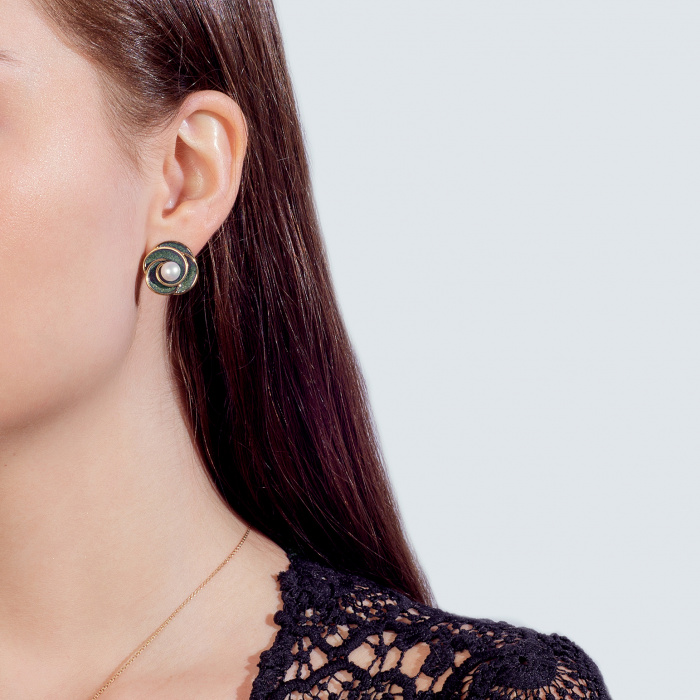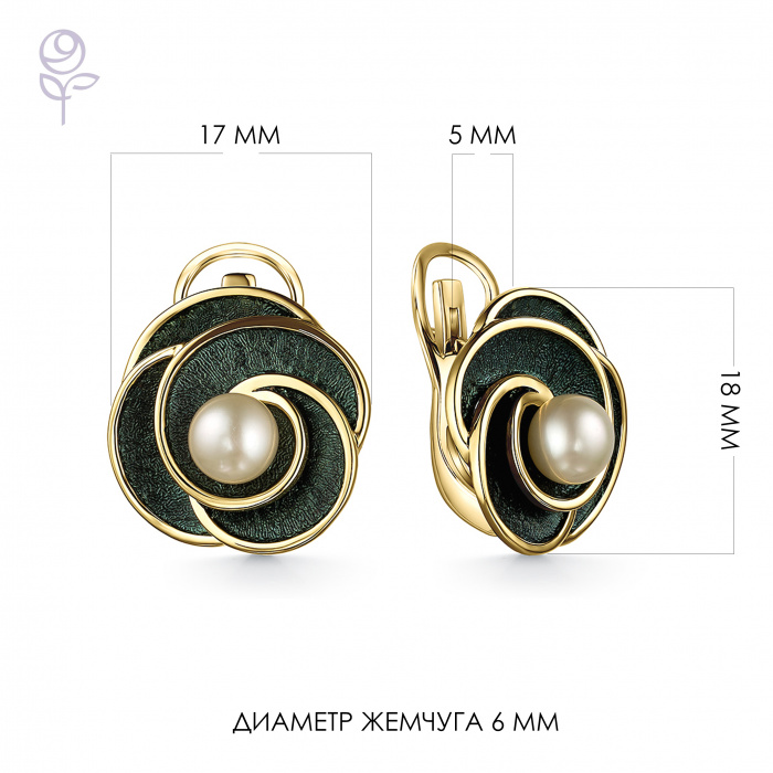 Вставка: жемчуг культивированный Размер жемчуга: 6-6,5 мм Форма огранки жемчуга: Кабoшон Покрытие: Позолота Цвет эмали: Зеленая Дополнительные вставки: Без вставок