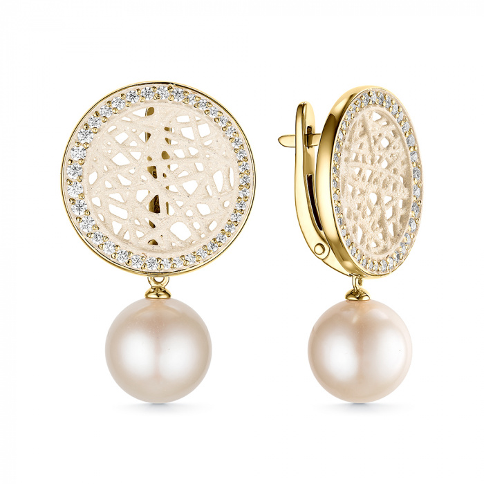 Вставка: жемчуг культивированный Размер жемчуга: 10-10,5 мм Форма огранки жемчуга: Круг Покрытие: Позолота Цвет эмали: Шампань Дополнительные вставки: Фианиты