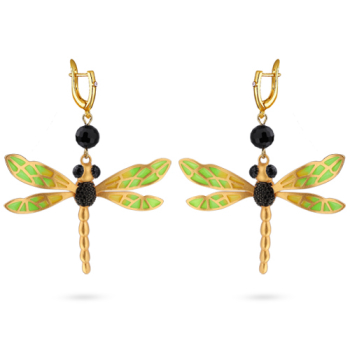 Изготовлено из ювелирного сплава на основе латуни с гальваническим покрытием матовым золотом. Изделие вручную расписано ювелирной краской зеленого и желтого цвета, покрыто эмалью и украшено черным агатом и фианитами.