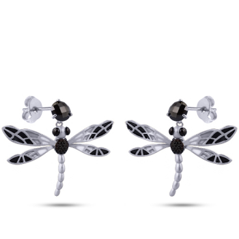 Изготовлено из ювелирного сплава с гальваническим покрытием матовым родием. Изделие покрыто эмалью черного и серого цета, украшено черным агатом и фианитами. Застёжка - гвоздики. Длина 5см.