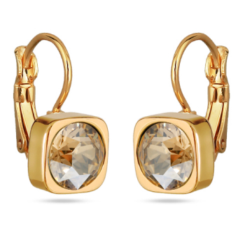 Изготовлено из ювелирного сплава на основе латуни с гальваническим покрытием золотом. Изделие украшают кристаллы SW цвета шампань диаметром 8мм. Длина серьги 1, 8см.