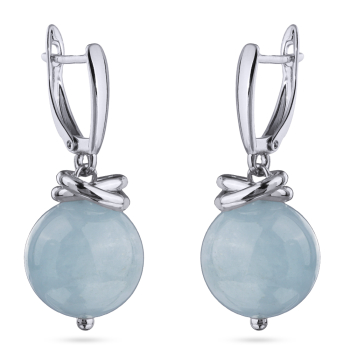Изготовлено из ювелирного сплава на основе латуни с гальваническим покрытием родием. Изделие украшает аквамарин диаметром 12мм. Длина серьги 2.7см. Английская застежка.