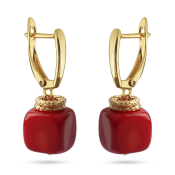 Изготовлено из ювелирного сплава на основе латуни с гальваническим покрытием золотом. Изделие украшает натуральный коралл красного цвета размером 10х10мм. Длина серьги см. Английская застежка.