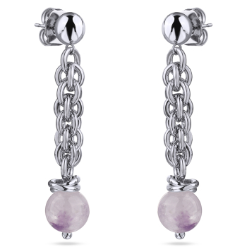 Изготовлено из ювелирного сплава на основе латуни с гальваническим покрытием родием. Изделие украшает фиолетовый морганит диаметром 10мм. Длина 6см. Застежка-гвоздики.