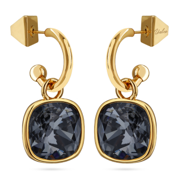 Изготовлено из ювелирного сплава на основе латуни с гальваническим покрытием золотом. Изделие украшают темно-серые кристаллы SW диаметром 12мм. Длина серьги 3см. Застежка-хупы.