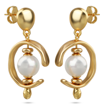 Изготовлено из ювелирного сплава на основе латуни с гальваническим покрытием матовым золотом. Изделие украшает майорский круглый жемчуг белого цвета диаметром 12мм. Застежка-гвоздики. Размер серьги 5х2.5см.