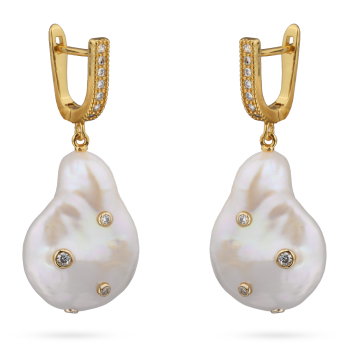 Изготовлено из ювелирного сплава на основе латуни с гальваническим покрытием золотом. Изделие украшают барочный жемчуг диаметром 20мм и белый фианит Длина 3, 5см. Английская застежка. *Цвет и форма жемчужин может отличаться от изображенной на фото.