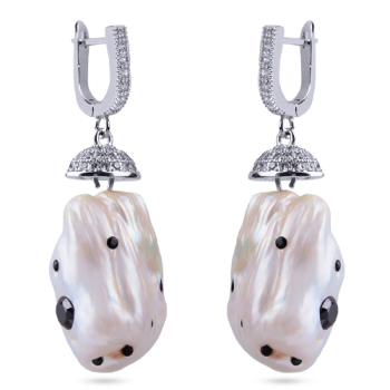 Изготовлено из ювелирного сплава на основе латуни с гальваническим покрытием родием. Изделие украшают барочный жемчуг белого цвета и черные кристаллы. Английский замок. Длина 4.5см.