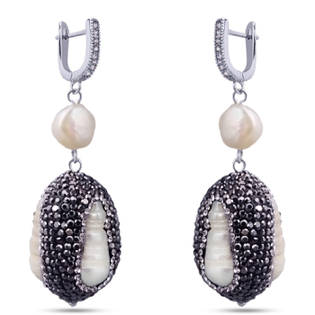 Серьги (жемчуг барочный белый, кристаллы черные; покрытие родий), Есть комплект