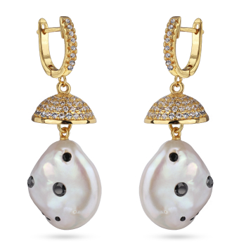 Серьги (жемчуг барочный белый, кристаллы черные; покрытие золото)
