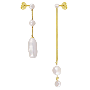Изготовлено из ювелирного сплава на основе латуни с гальваническим покрытием золотом. Изделие украшает барочный жемчуг белого цвета. Застежка-гвоздики. Длина 9см и 6.5см. *Цвет и форма жемчужин может отличаться от изображенной на фото.
