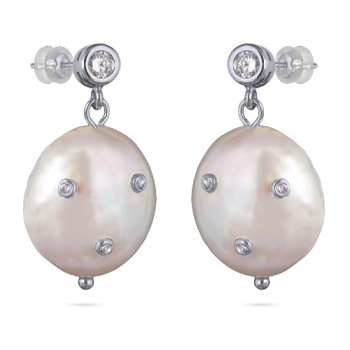 Изготовлено из ювелирного сплава на основе латуни с гальваническим покрытием родием. Изделие украшают жемчуг диаметром 20мм и белый фианит. Длина 3см. Застежка-гвоздики.