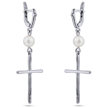 Изготовлено из ювелирного сплава на основе латуни с гальваническим покрытием родием. Изделие украшает натуральный жемчуг белого цвета диаметром 8мм. Размер серьги 6, 3х2см. Английская застежка.
