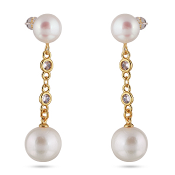 Изготовлено из ювелирного сплава на основе латуни с гальваническим покрытием золотом. Изделие украшают перламутр диаметром 9-11мм и белый фианит. Длина 4, 5см. Застежка-гвоздики.