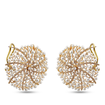 Изготовлено из ювелирного сплава на основе латуни с гальваническим покрытием золотом. Изделие украшают жемчуг белого цвета и фианиты. Диаметр серьги 4см. Итальянская застежка. *Цвет и форма жемчужин может отличаться от изображенной на фото.