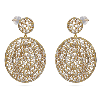 Изготовлено из ювелирного сплава на основе латуни с гальваническим покрытием золотом. Изделие украшают жемчуг и белый фианит. Размер серьги 6х4см. Застежка-гвоздики.