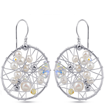 Изготовлено из ювелирного сплава на основе латуни с гальваническим покрытием родием. Изделие украшают белый жемчуг и фианит белого хамелеон цвета. Размер серьги 5х3.5см. Застежка-крючок.
