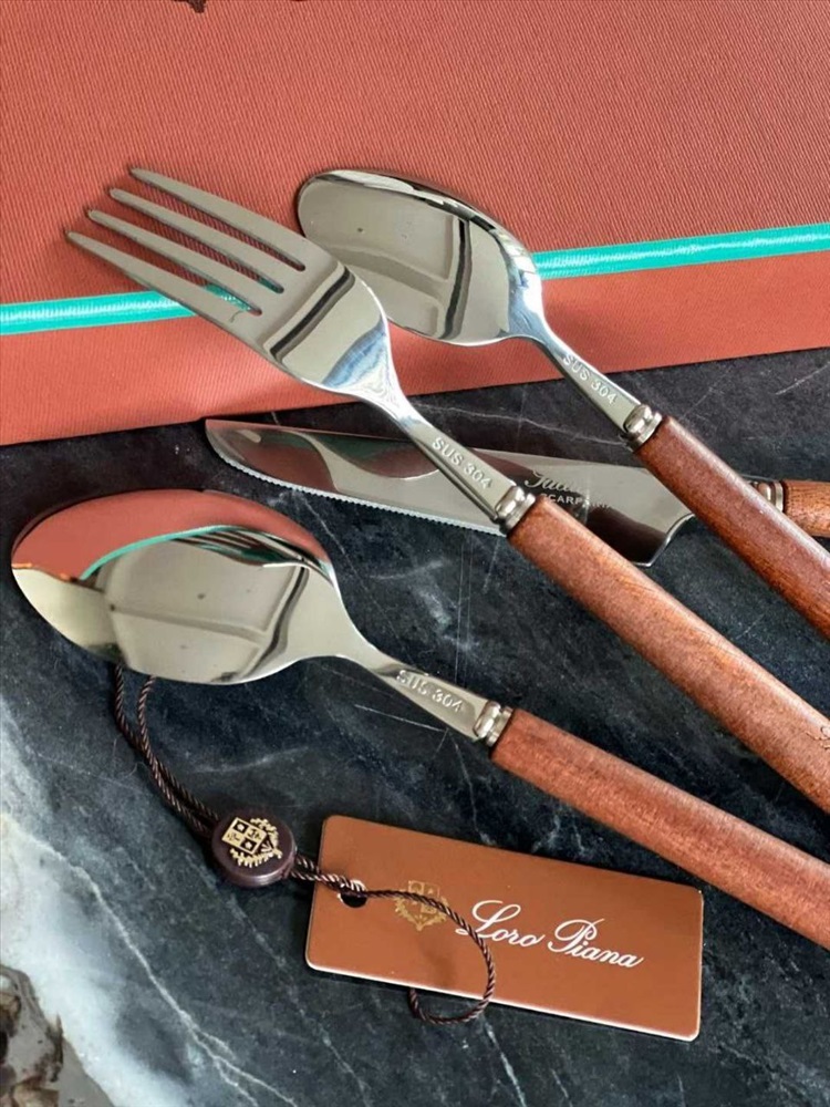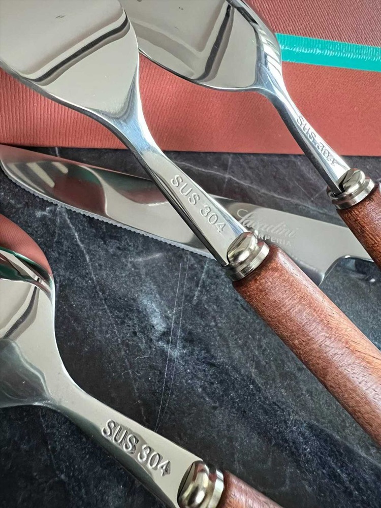 Металлическая часть изготовлена из нержавеющей стали sus304, утолщенного материала, тканевого круга, зеркальной полировки, гладких краев. Прочная и легко моющаяся, кончик вилки тонкий, отполированный, без заусенцев, лезвие широкое, острое и зазубренное.