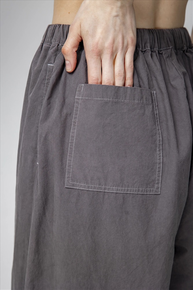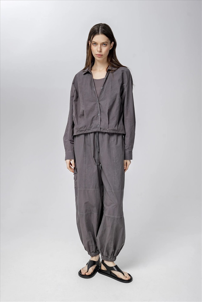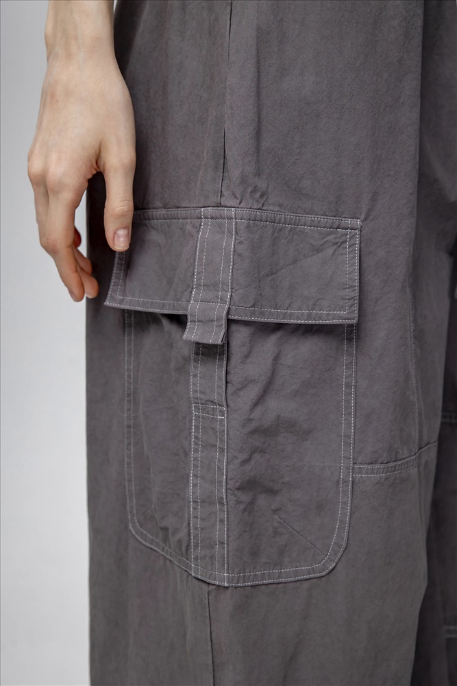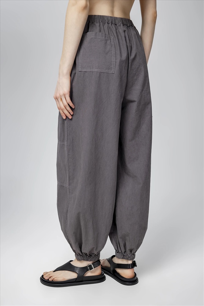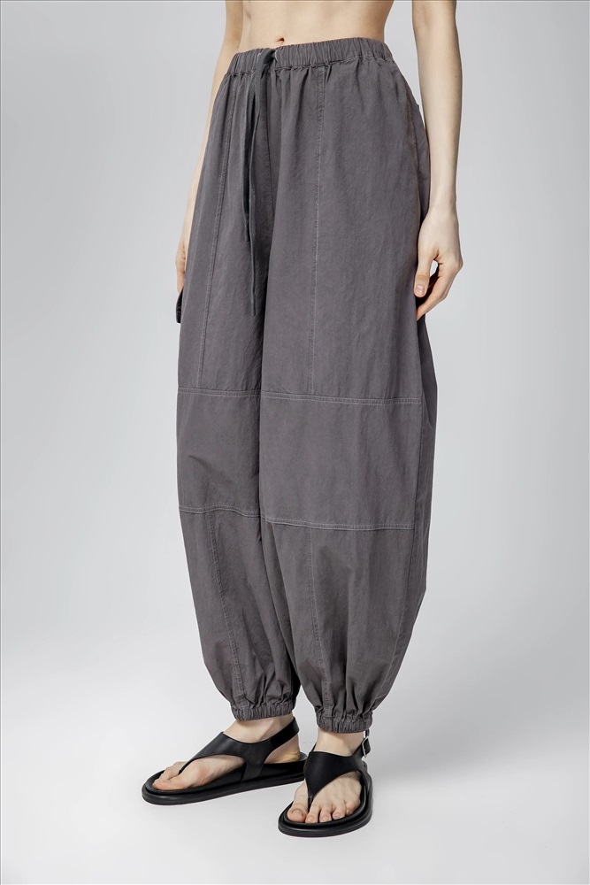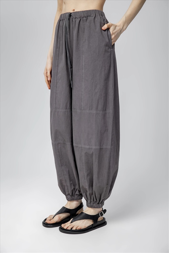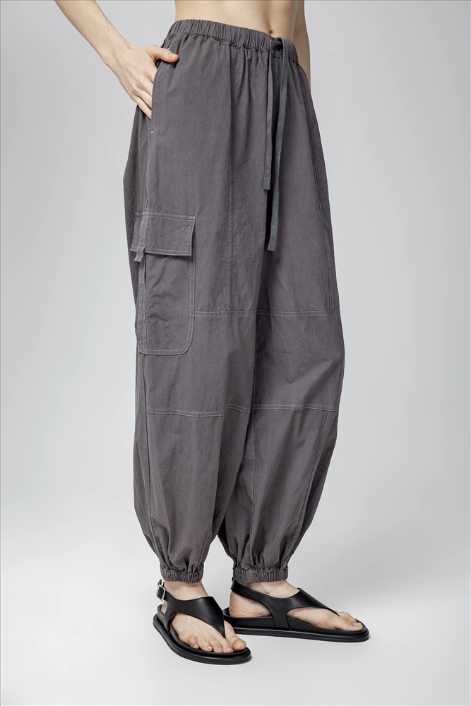 весна-лето 100% Хлопок Брюки-алладины с резинкой на поясе и по низу штанины. Посадка на уровне талии. В районе колен декоративные резы. По бокам врезные карманы, а на бедрах накладные карманы с клапанами. Выполнены из 100% хлопка, в сером цвете. Акцентной деталью изделия является варка.