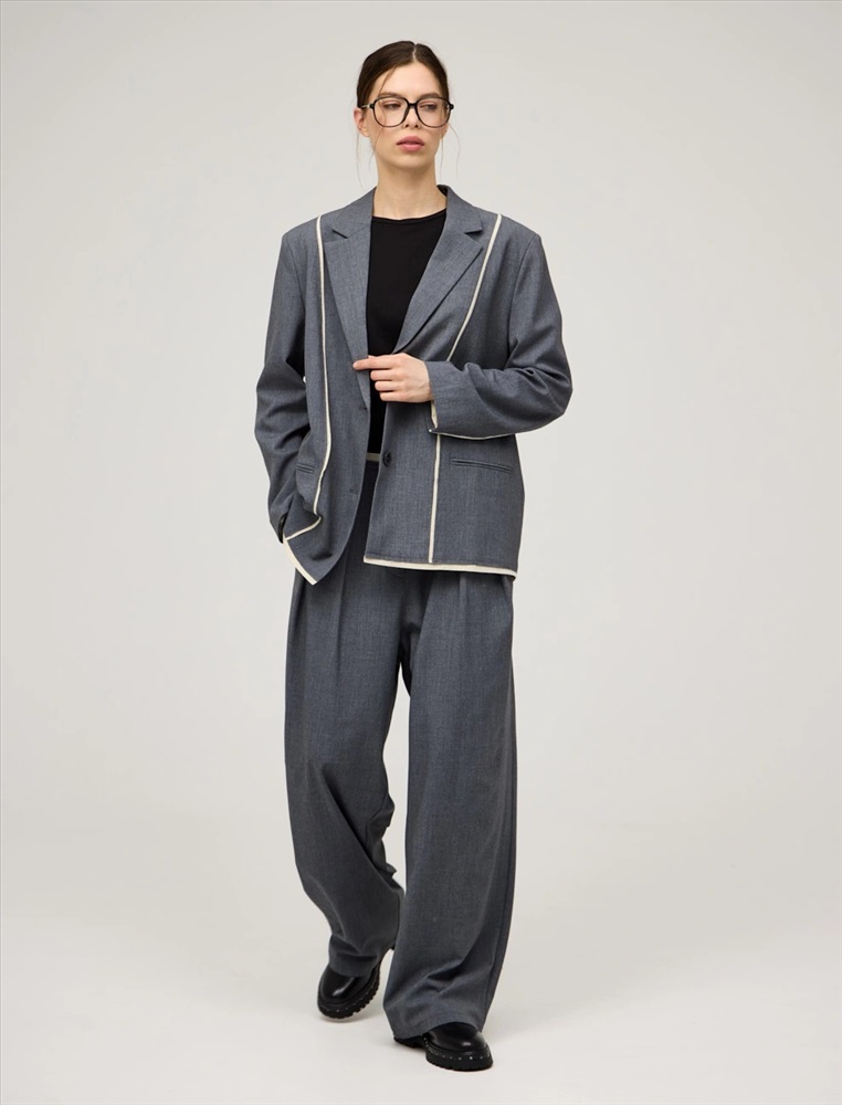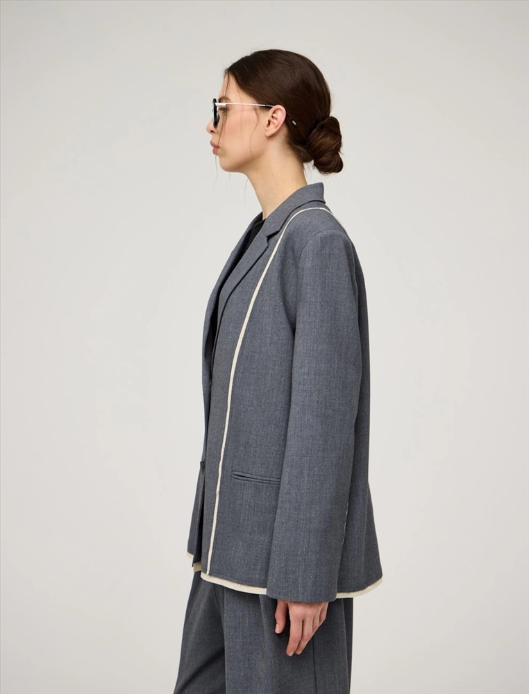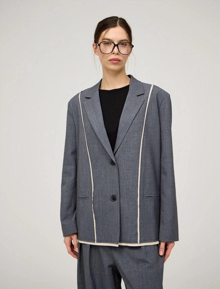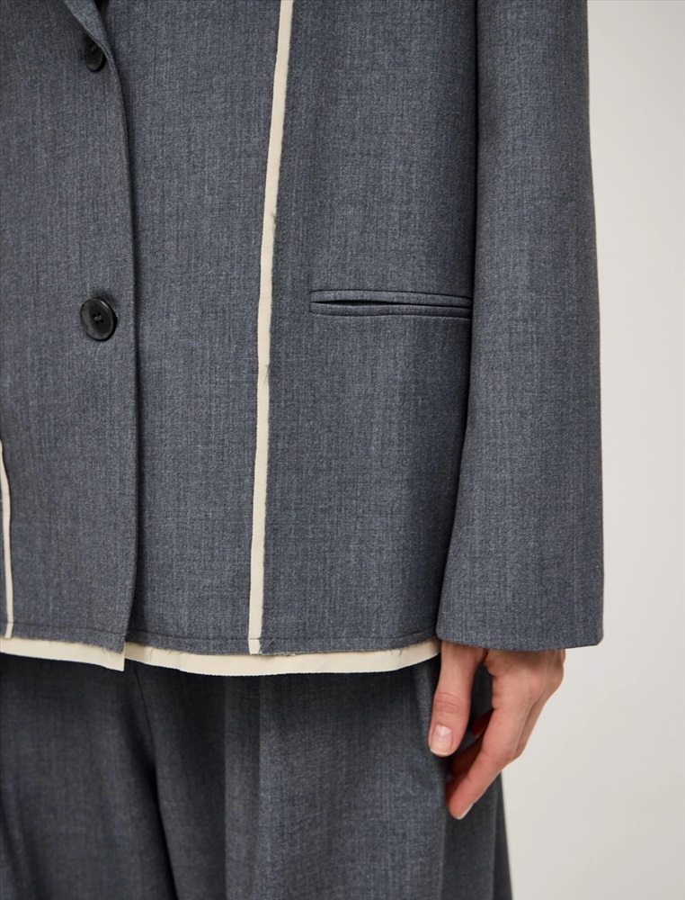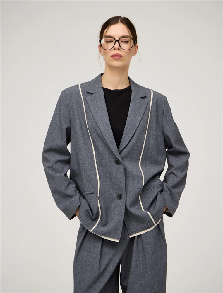 Однобортный жакет прямого силуэта. По передней части изделия — лацканы, застежка на пуговицы и карманы в рамку. Акцентной деталью модели являются контрастные резы с эффектом необработанного края спереди, по рукавам и по низу. Жакет выполнен из хлопка, района, кашемира и спандекса. Представлен в сером цвете.