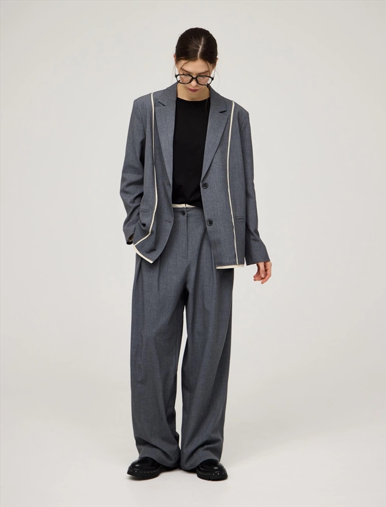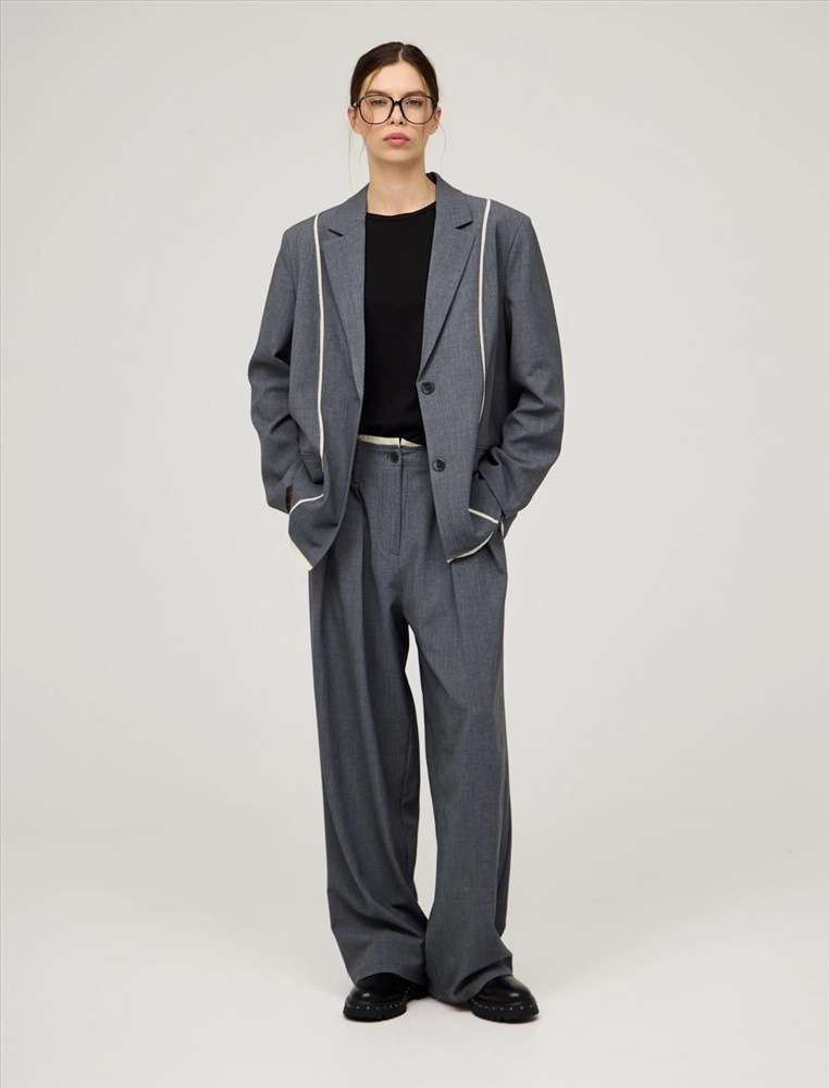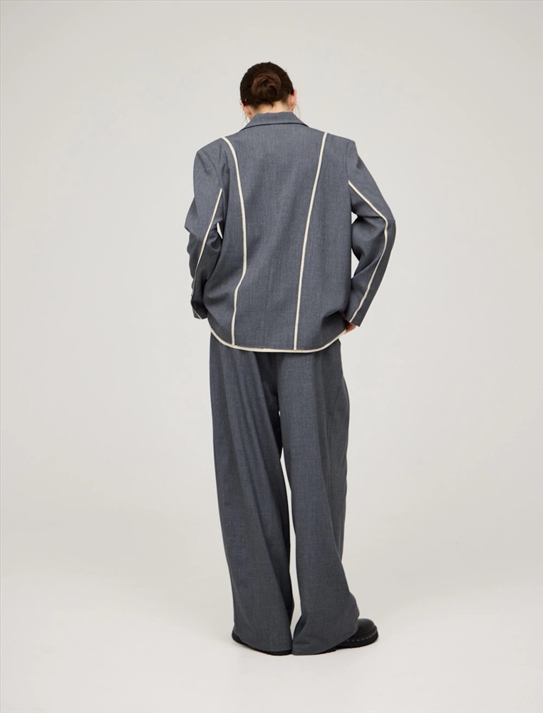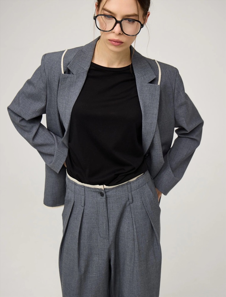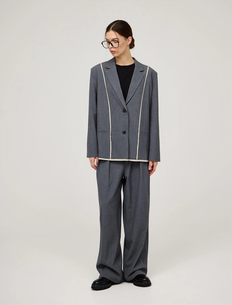Однобортный жакет прямого силуэта. По передней части изделия — лацканы, застежка на пуговицы и карманы в рамку. Акцентной деталью модели являются контрастные резы с эффектом необработанного края спереди, по рукавам и по низу. Жакет выполнен из хлопка, района, кашемира и спандекса. Представлен в сером цвете.