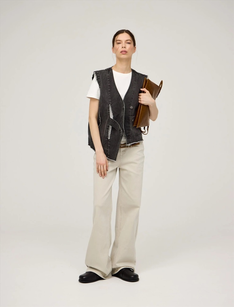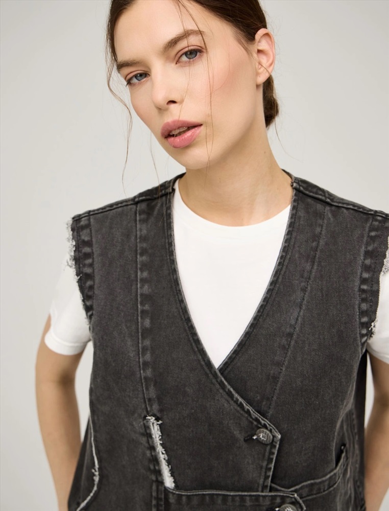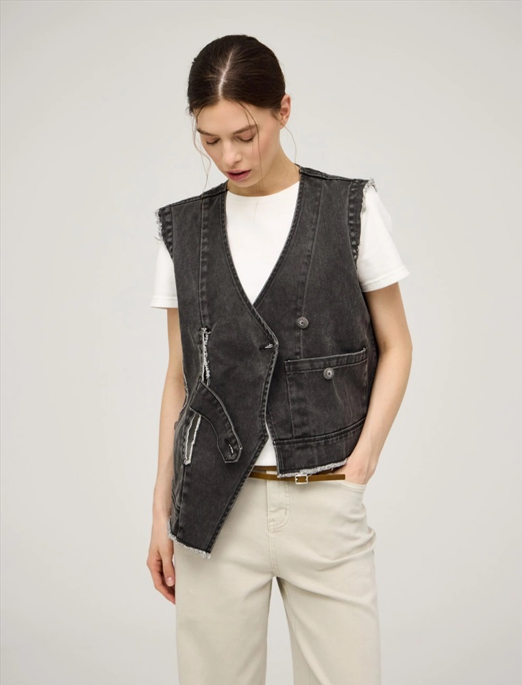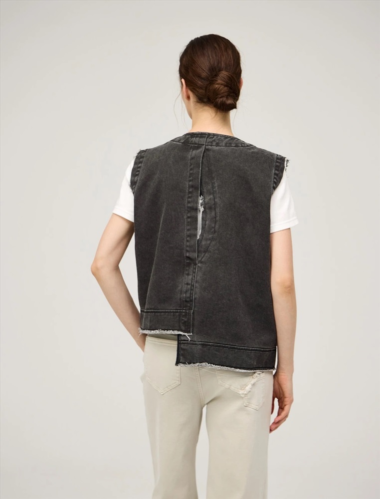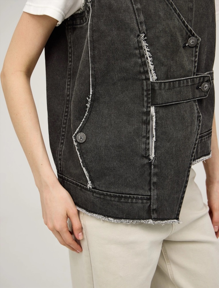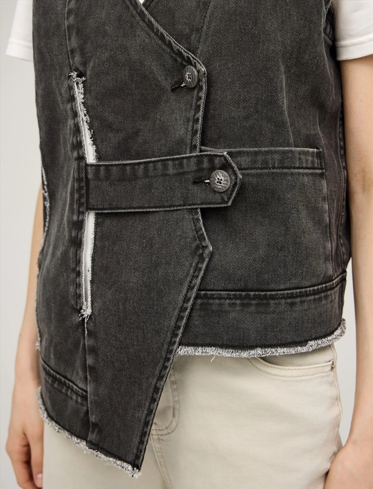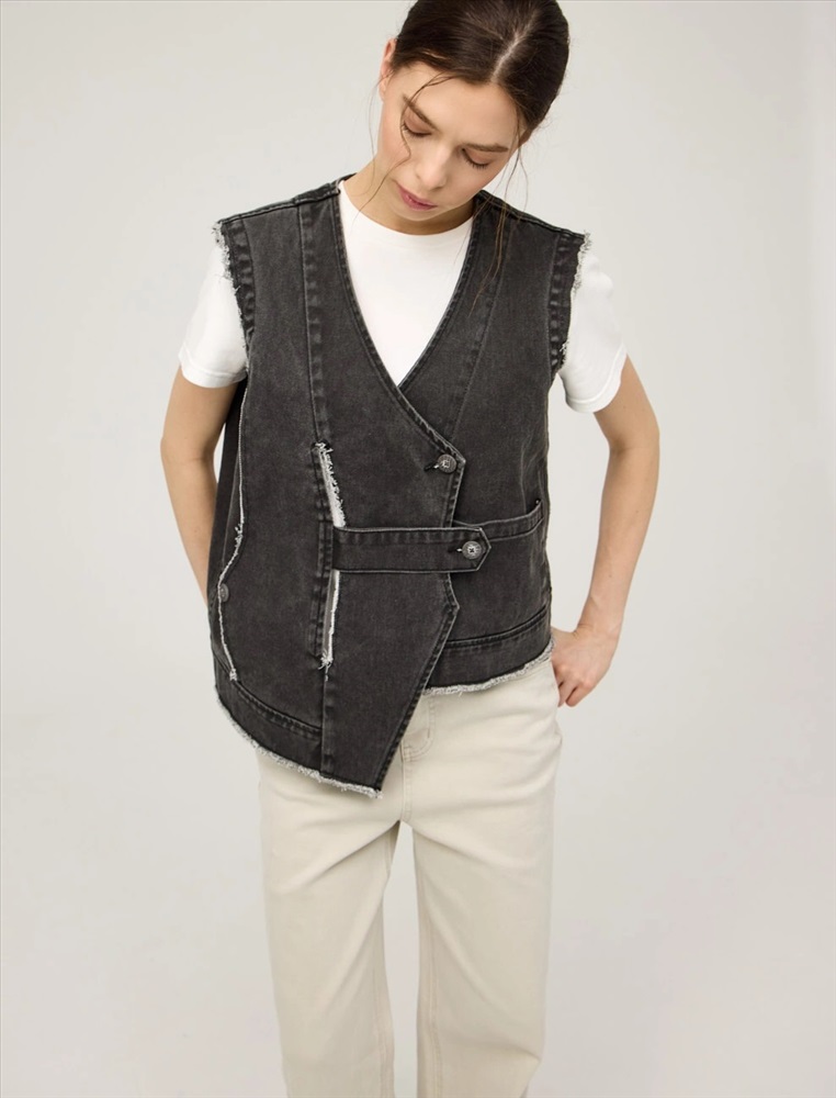 Однобортный жилет прямого силуэта с асимметричным низом. По передней части изделия — V-образный вырез, застежка на пуговицы и хлястик. Акцентной частью жилета является гранжевый эффект необработанного края по всему изделия. Выполнена из денима. Энзимная варка изделия создает состаренный эффект ткани. Представлена в сером цвете.