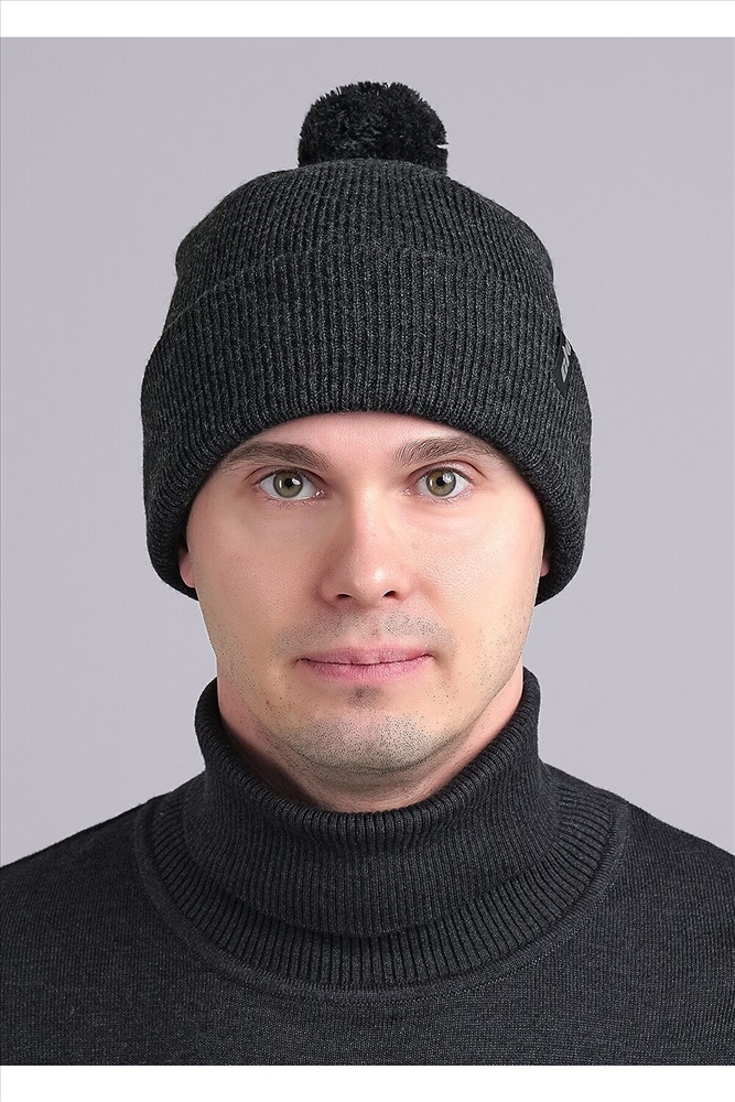 Шапка мужская двойная с отворотом. Декорирована стильной нашивкой логотип и ниточным помпоном.