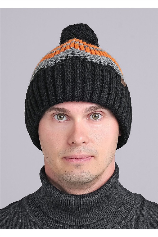 Мужская шапка жаккардового переплетения с отворотом, декорирована нашивкой логотип и ниточным помпоном. Утепление флисом по всей голове. Отлично подойдёт для холодной зимы.