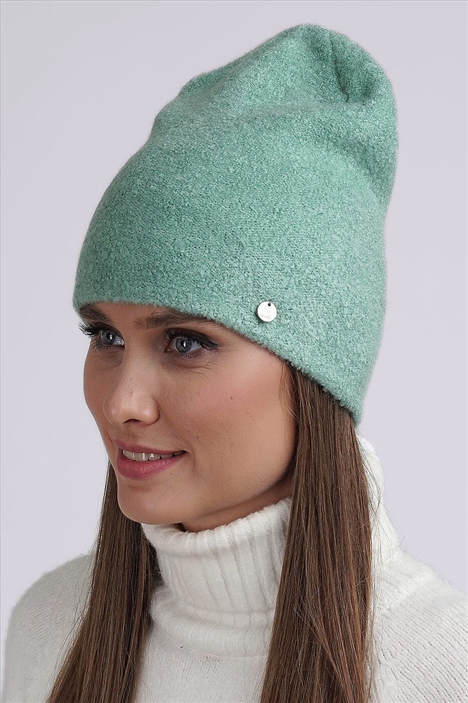 Шапка женская двойная, декорированная круглой маталлической нашивкой. Подходит в осенне-зимний период.