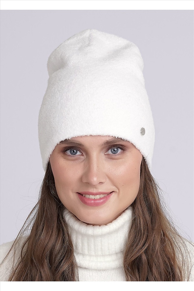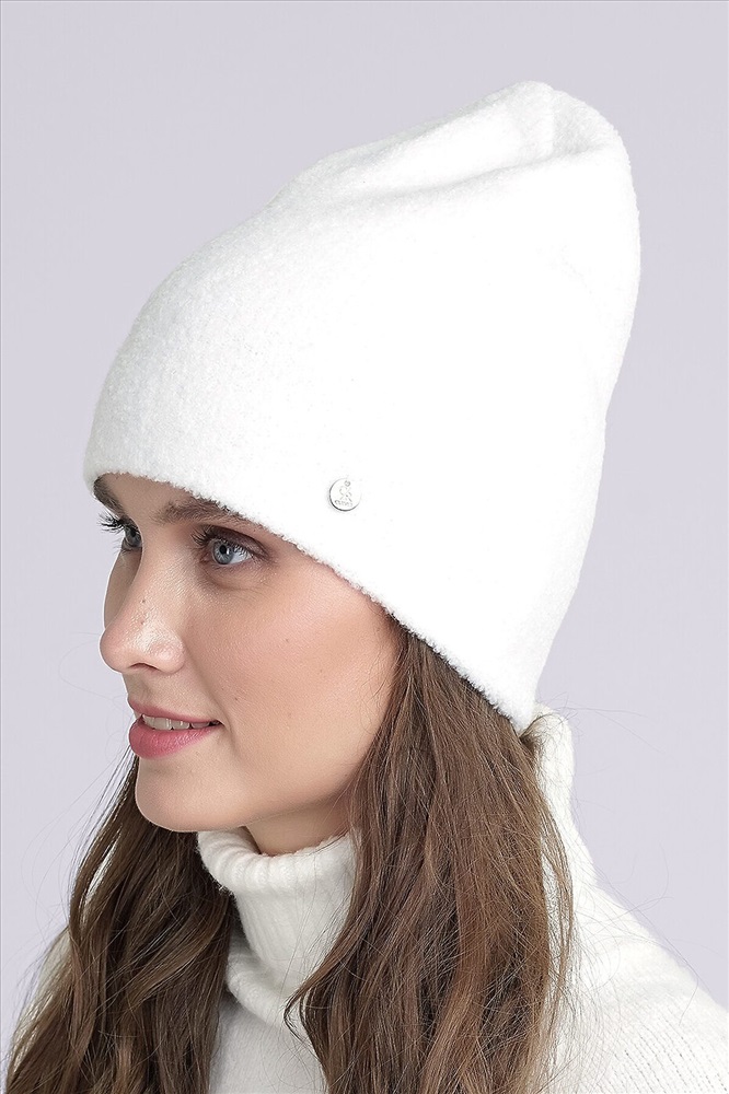 Шапка женская двойная, декорированная круглой маталлической нашивкой. Подходит в осенне-зимний период.