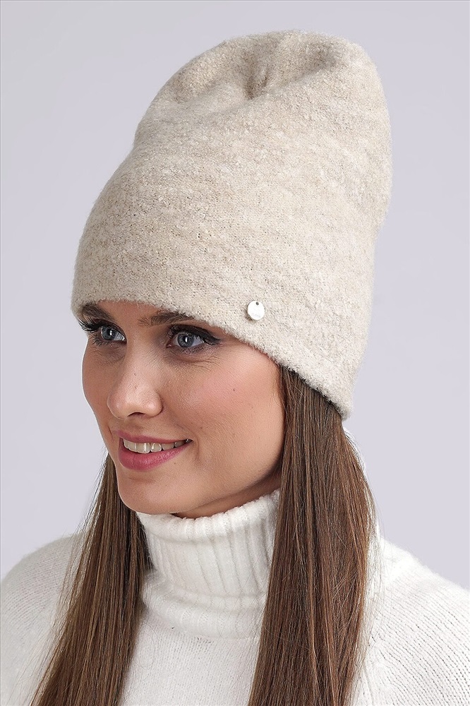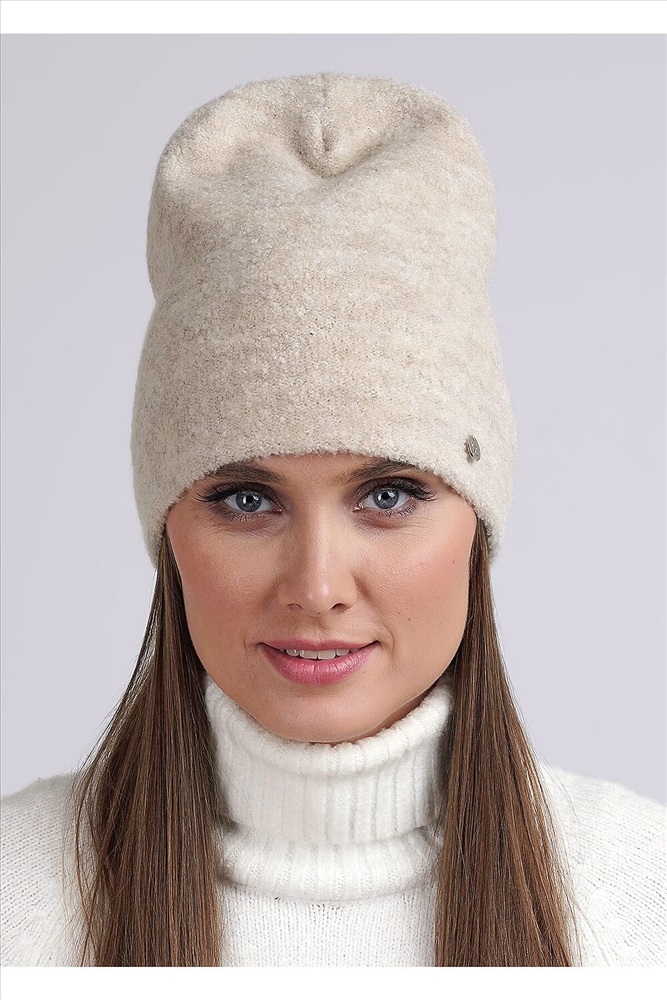 Шапка женская двойная, декорированная круглой маталлической нашивкой. Подходит в осенне-зимний период.