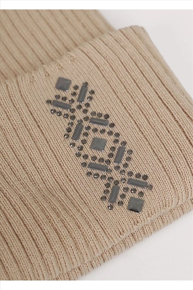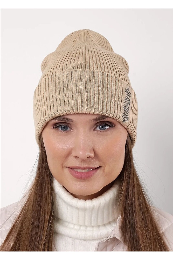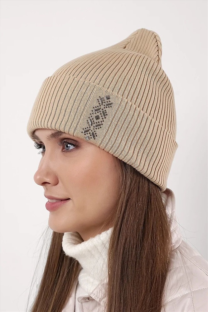 Шапка женская двойная с отворотом, без подклада. На отвороте декорирована стразами. Изготовленная из хлопка. Идеальный вариант на осень, весну.