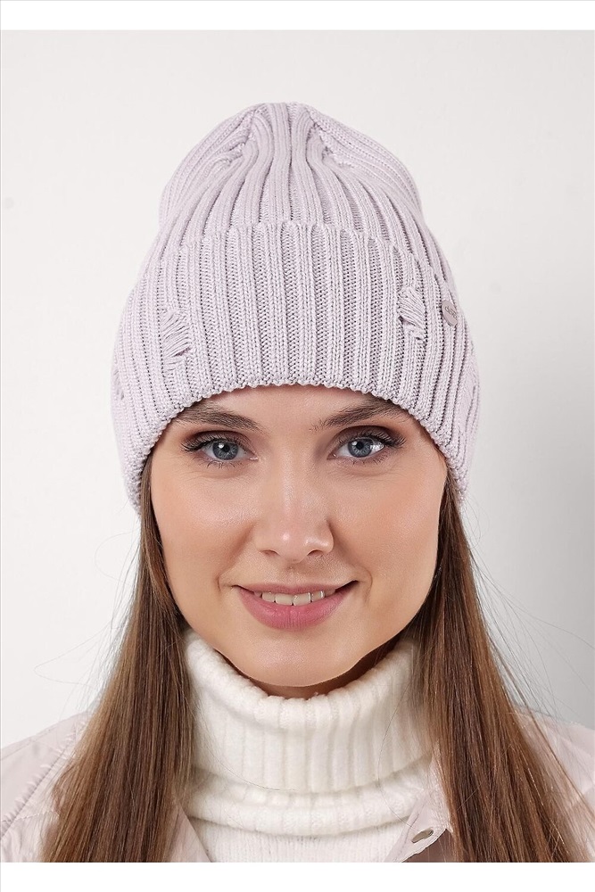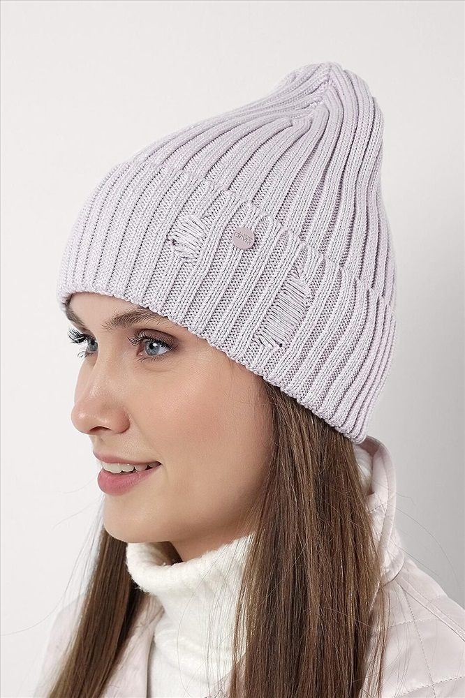 Хит сезона- "рваная" шапка в стиле кежуал. Шапка женская с отворотом, декорирована стильной нашивкой в височной зоне. Отлично подойдет для холодной осени- тёплой зимы.