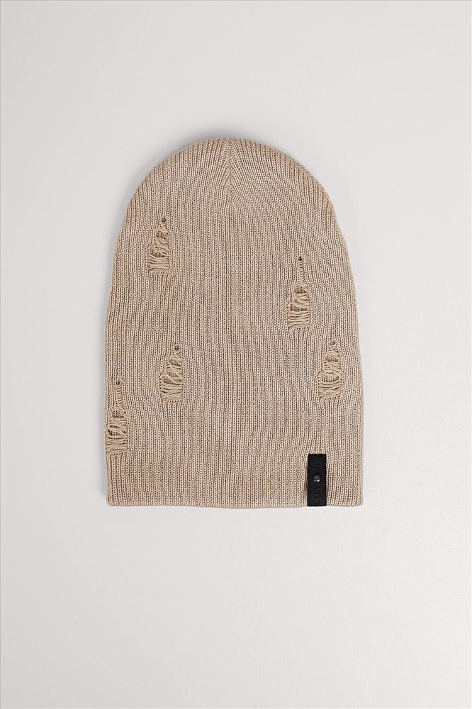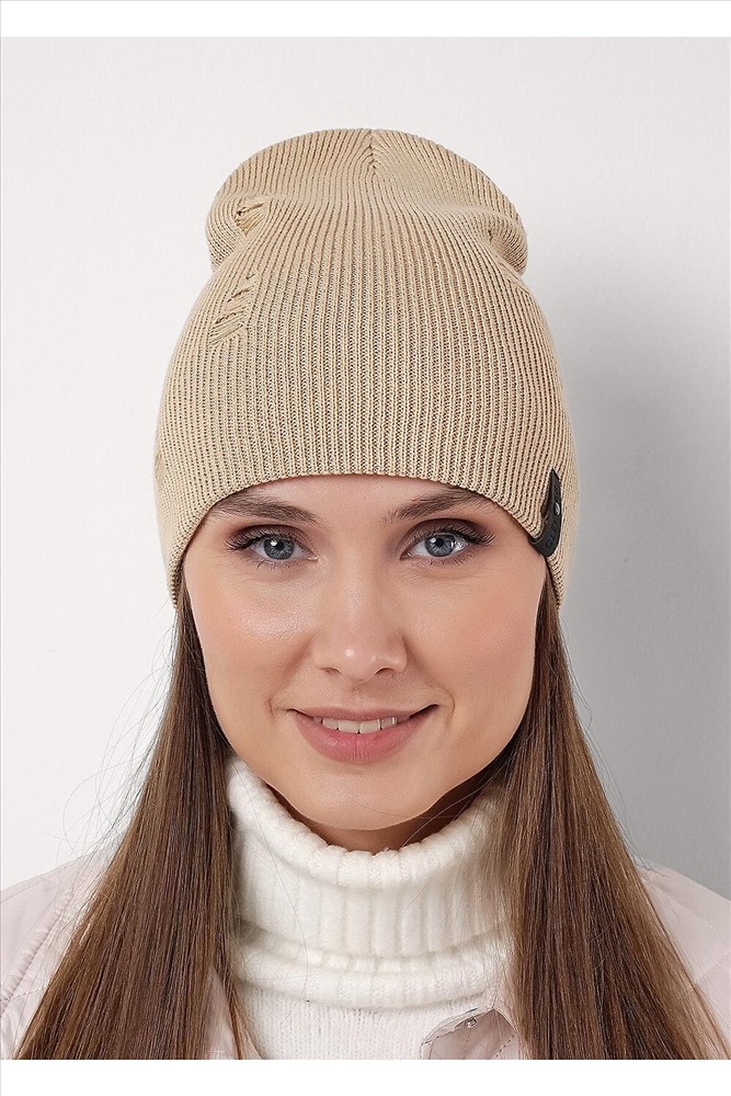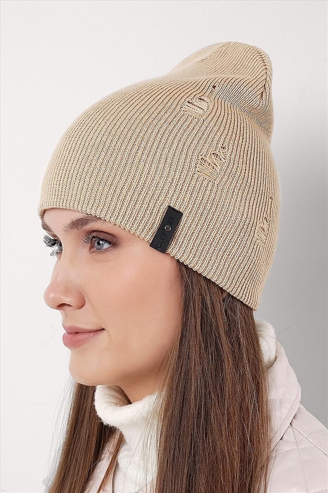 Двойная "рваная" женская шапка в стиле кэжуал без отворота, без утеплителя, декорирована стильной нашивкой. Шапка подходит для прогулок, походов и повседневной носки, поэтому станет идеальным решением на весну.