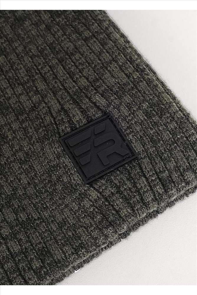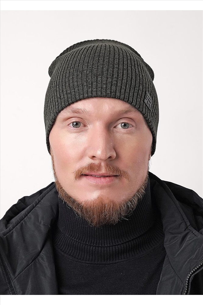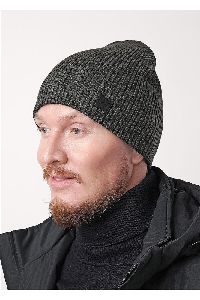 Мужская шапка двойная без отворота, без подклада, декорирована стильной нашивкой. Идеальный вариант на осень, весну.