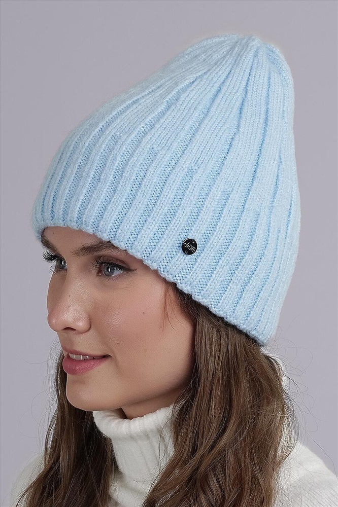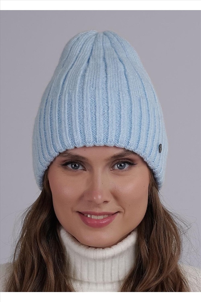 Женская двойная шапка, декорирована нашивкой логотип. Отлично подойдёт для зимы.