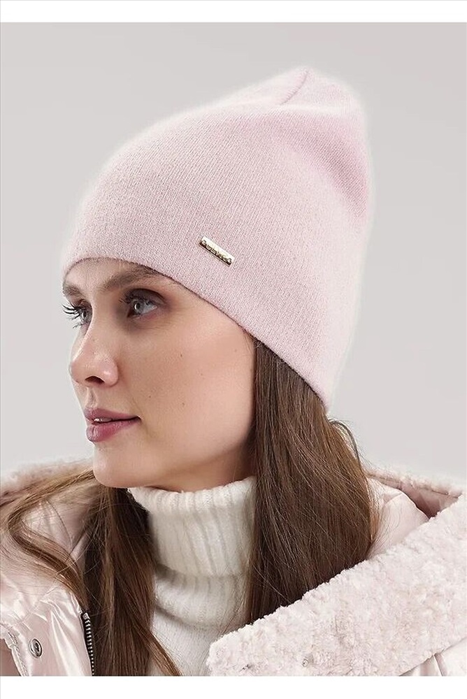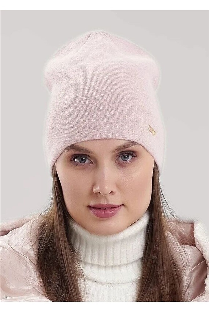 Шапка женская двойная без отворота с пряжей ангора, без подклада, декорирована стильной нашивкой в височной зоне. Станет не только отличной защитой от холода, но и модным аксессуаром.