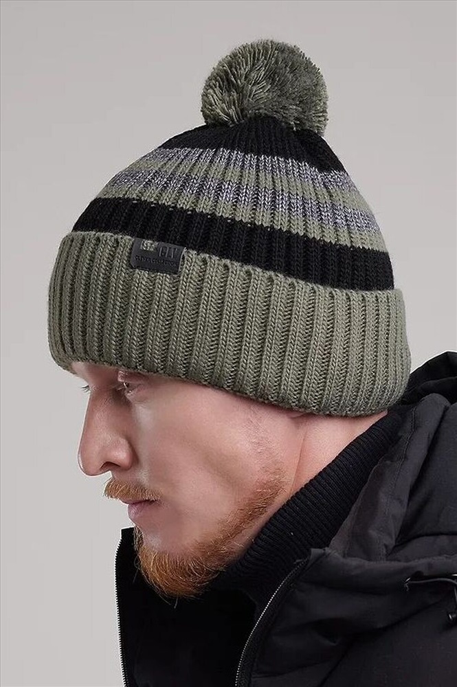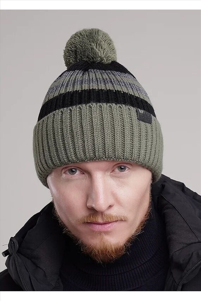 Шапка мужская с отворотом, с помпоном, с подкладом из флиса. Выполнена из высококачественной пряжи, декорирована стильной нашивкой. Станет не только отличной защитой от холода, но и модным аксессуаром.