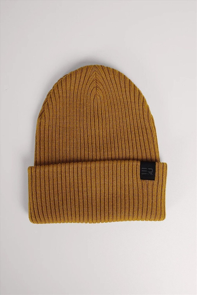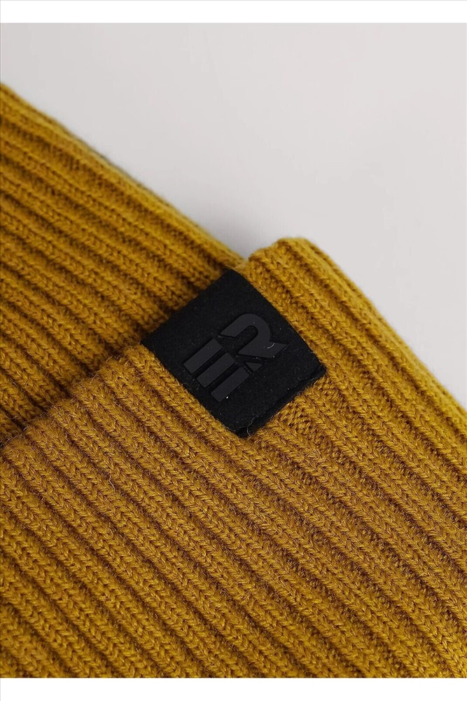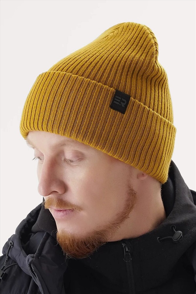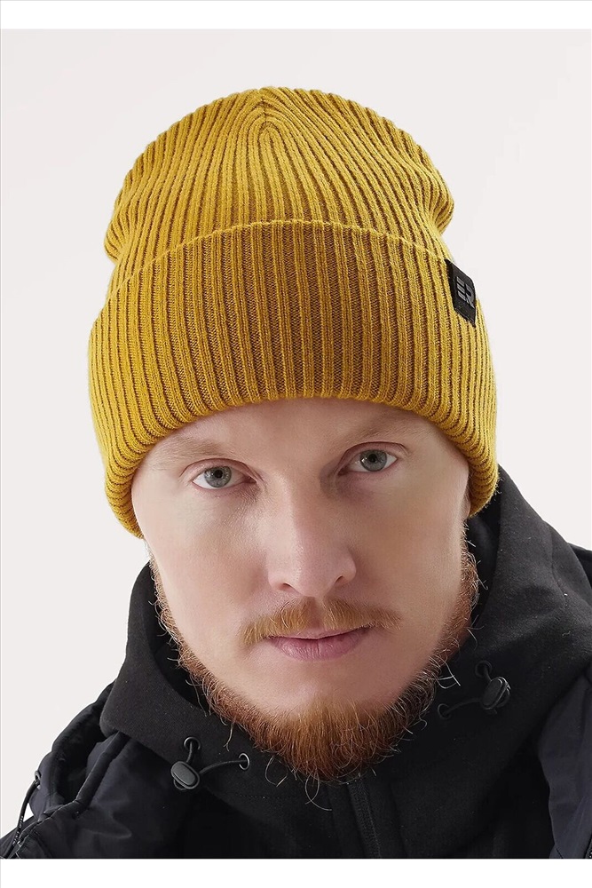 Мужская шапка с отворотом выполнена из высококачественной пряжи с добавлением шерсти, декорирована логотипом- нашивкой.