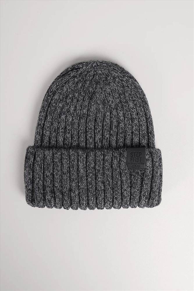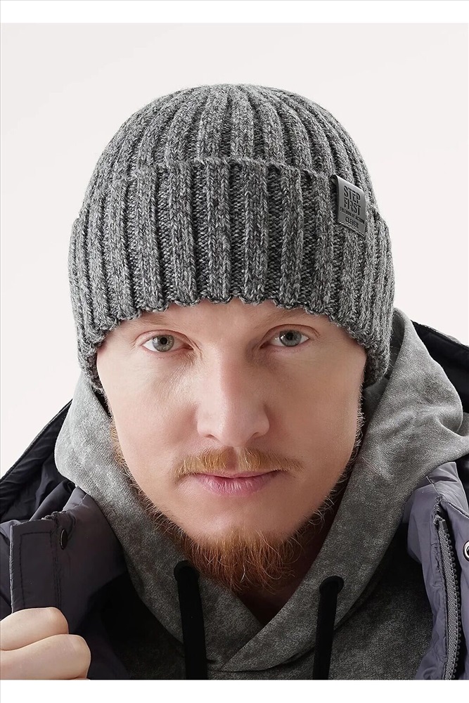 Мужская шапка из скрученой пряжи с отворотом, декорирована стильной нашивкой- логотип. Идеально подойдёт для холодной осени, тёплой зимы.