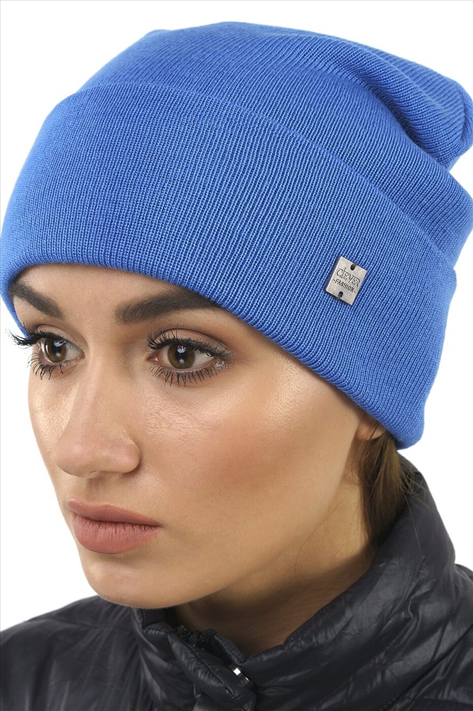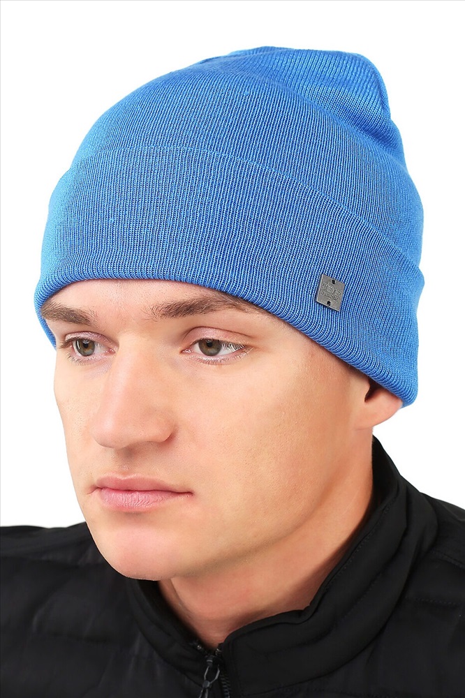Шапка, связанная гладью, с отворотом, с небольшим напуском, декорирована имиджевой логотипом-нашивкой, без утепления на флисе. Размер 58.