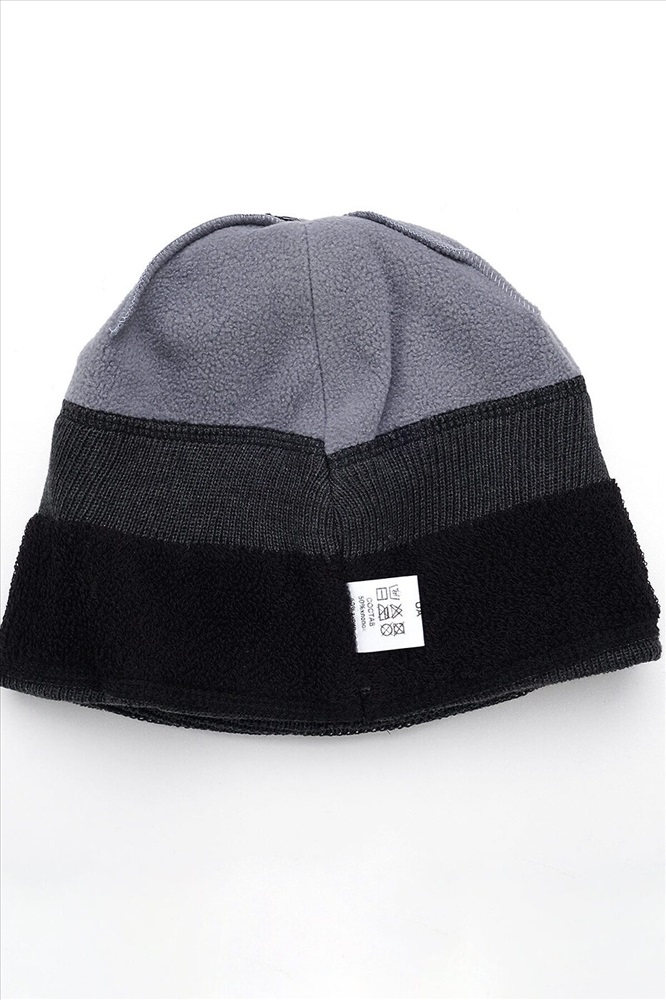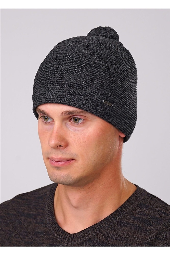Шапка, связанная фактурной вязкой, с круговым утеплением на плюше, с помпоном, декорирована имиджевой нашивкой
