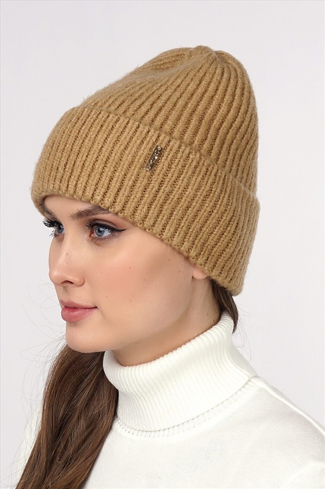Женская однослойная шапка с отворотом, выполнена ластичным переплетением, декорирована имиджевой нашивкой логотип. Подойдёт для холодной осени- тёплой зимы.