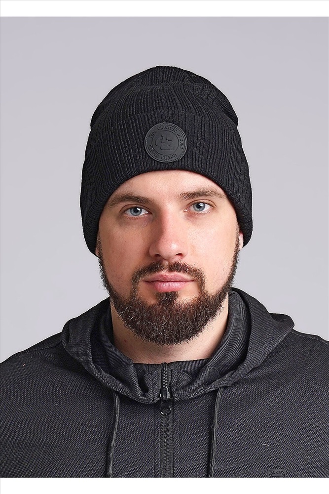 Мужская двойная шапка с отворотом, выполнена ластичным переплетением. Декорирована силиконовой нашивкой в центральной части.