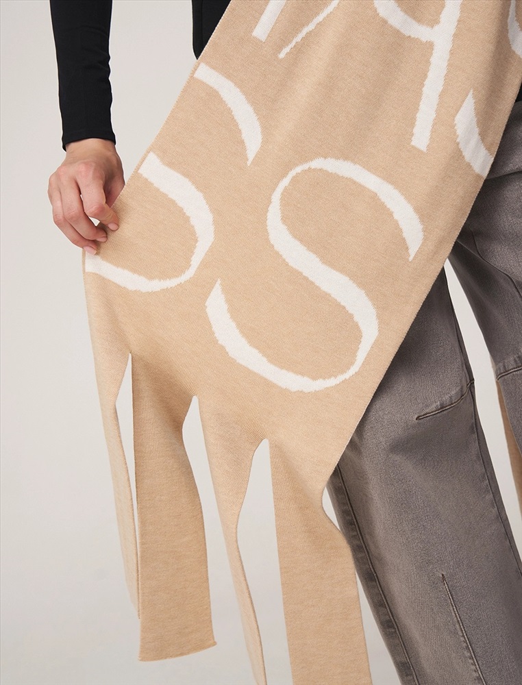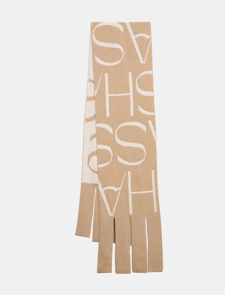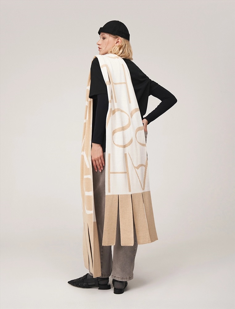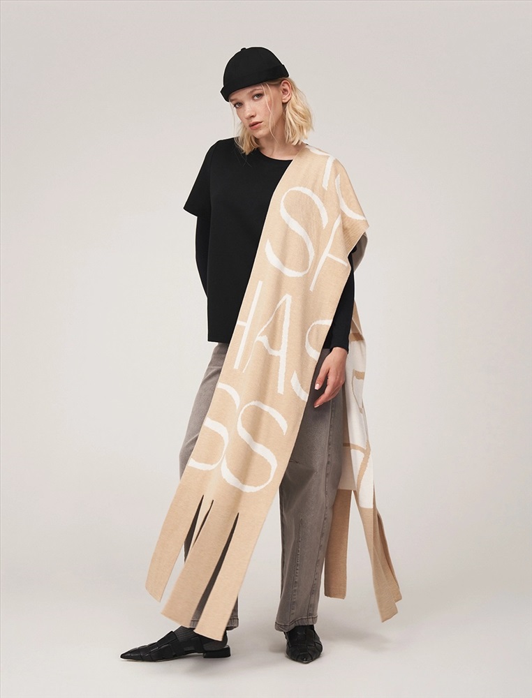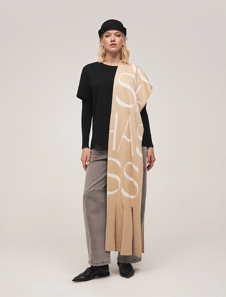 Широкий прямоугольный шарф-палантин с разрезами по низу и акцентным принтом HASS станет отличным дополнением к любому образу. В составе хлопок, акрил, шерсть и кашемир. Представлен в бежевом и синем цвете.